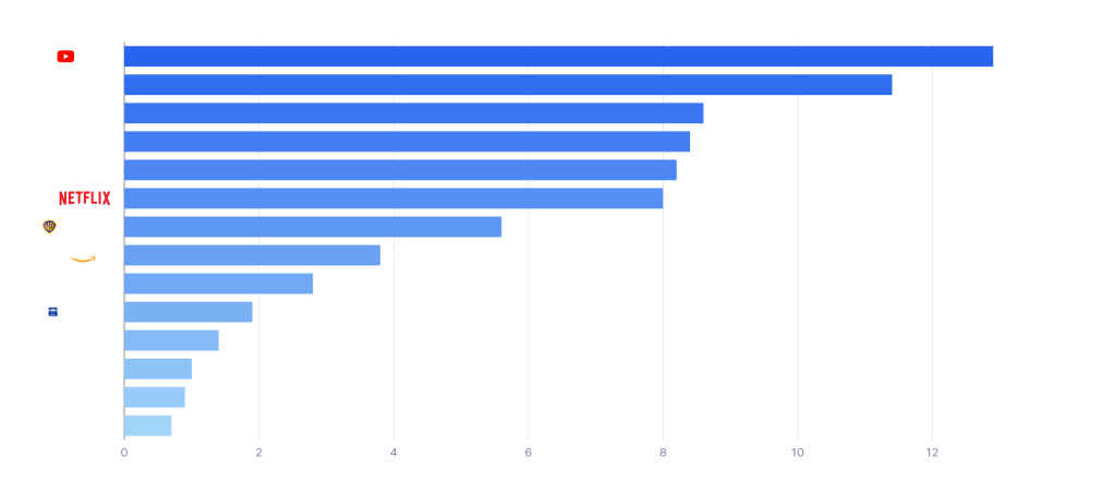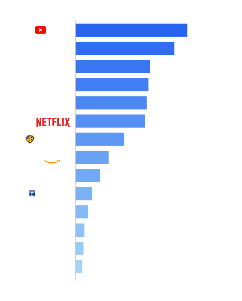 Streaming platforms listed as “other streaming” includes any high-bandwidth video streaming on television that is not individually broken out. Apps designed to deliver live broadcast and cable (linear) programming (VMVPD or MVPD applications like Sling TV or Charter/Spectrum) are excluded from “other streaming.”