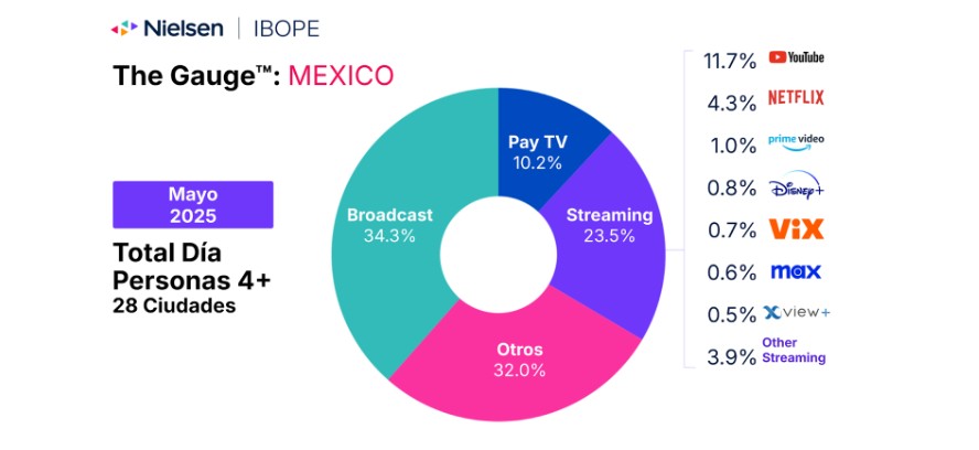 Durante mayo, la participación de streaming en México mostró un ligero decremento de 0.8 puntos respecto al mes anterior, representando el 23.5% del total de visualización de televisión.