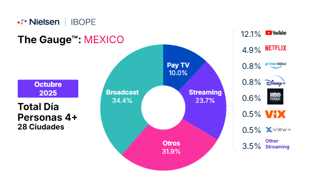 Aviso: YUMI TV, Base de datos Streaming Transición - 1,650 hogares de 28 ciudades principales con y sin internet de banda ancha. Screen: TV. Target: Total personas 4+. Universo Total Personas 4+: 60,605,522. Periodo: Octubre 2025. Franja: Total día - 2:00 a 26:00 hrs. Tipo de audiencia: Consolidado (Live+TSV 7 días+VOD). Información sólo a ser usada como referencia.