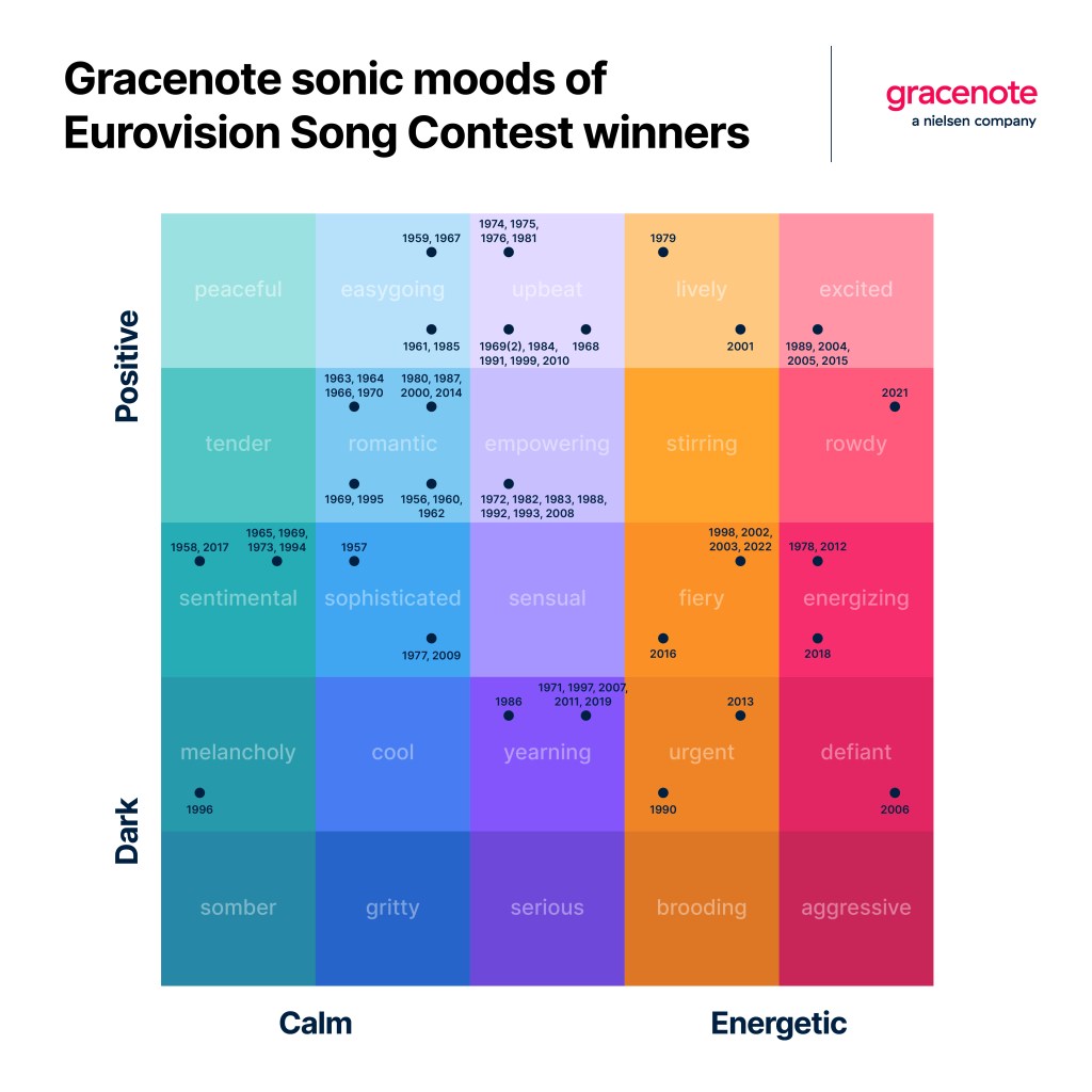 The shift toward more energetic moods bodes well for competitors, as half of the 24 winning songs between 1998 and 2022 were characterized by five moods at the more energetic side of the spectrum: “energizing,” “excited,” “fiery,” “rowdy” and “urgent.” And in the last decade, seven of the last 10 winning songs have expressed at least one of these moods. This year, 19 of the 37 entries express “energizing,” “excited,” “fiery,” “rowdy” or “urgent” as their main mood.