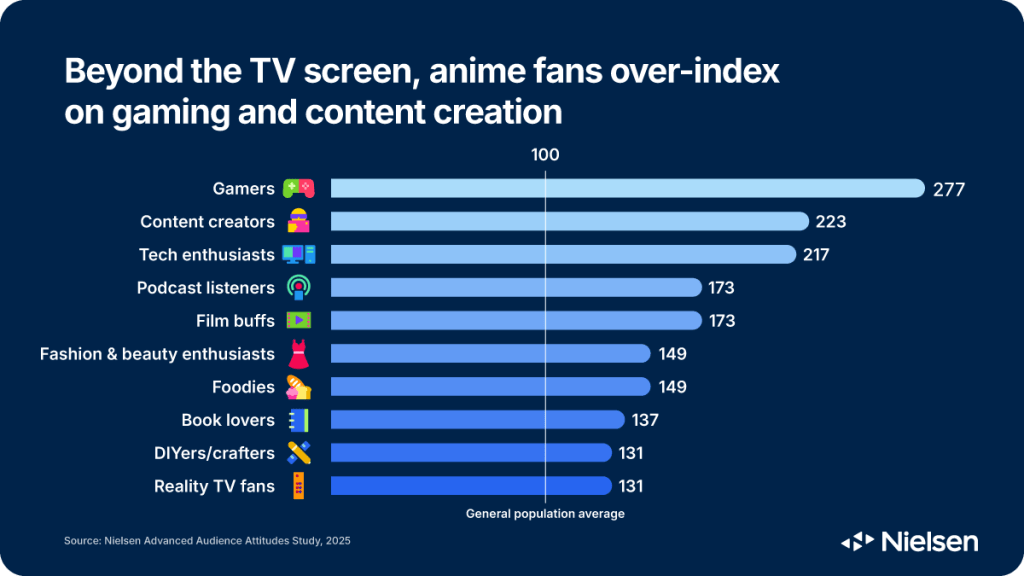 Anime fans are much more than passive viewers. They are multi-faceted enthusiasts who are hyper-engaged across the digital ecosystem. Their interests also span multiple consumer categories with the spending power to engage these passions.