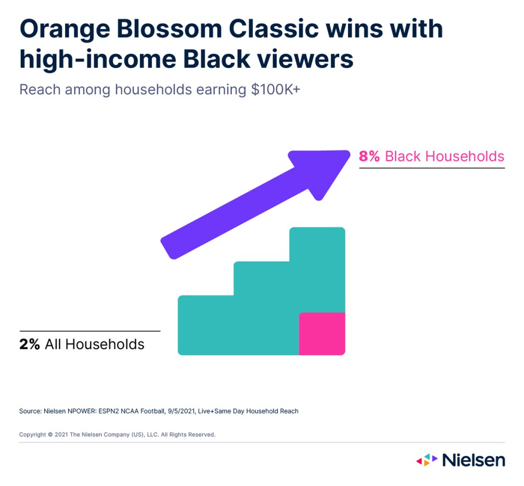 Scripted programming aside, sports content is the primary way that the HBCU fanbase sees programming that showcases their distinct culture today. The increase in HBCU football games airing on national networks included the return of the Orange Blossom Classic between Jackson State and Florida A&M University, which boasted 4x the reach among Black households earning $100,000 or more compared with high-income households overall.