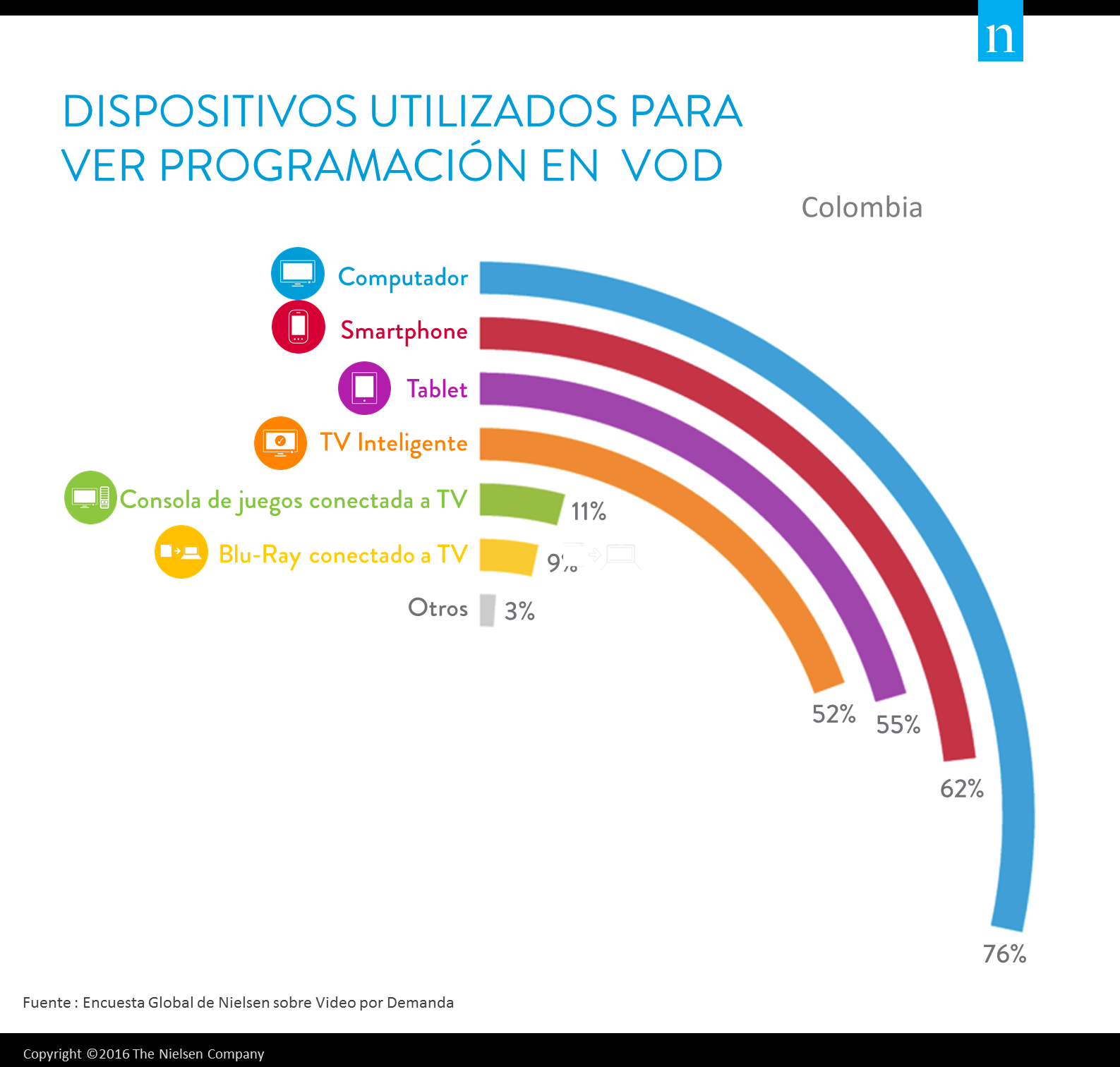 Seis de cada diez colombianos encuestados (62%) en el Estudio Nielsen Video on Demand (VOD por sus siglas en inglés) señalan que ven algún contenido en Video por Demanda, que incluye contenidos formato corto y/o largo, convirtiéndose en un formato que está tendiendo una importante aceptación y alcance entre los consumidores de contenidos de video/televisión.