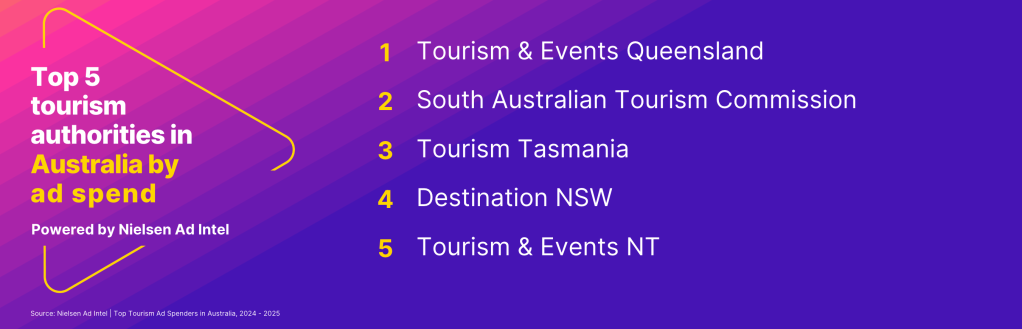 On the destination side, the top tourism advertisers were Tourism & Events Queensland, the South Australian Tourism Commission, Tourism Tasmania, Destination NSW and the Tourism & Events NT.