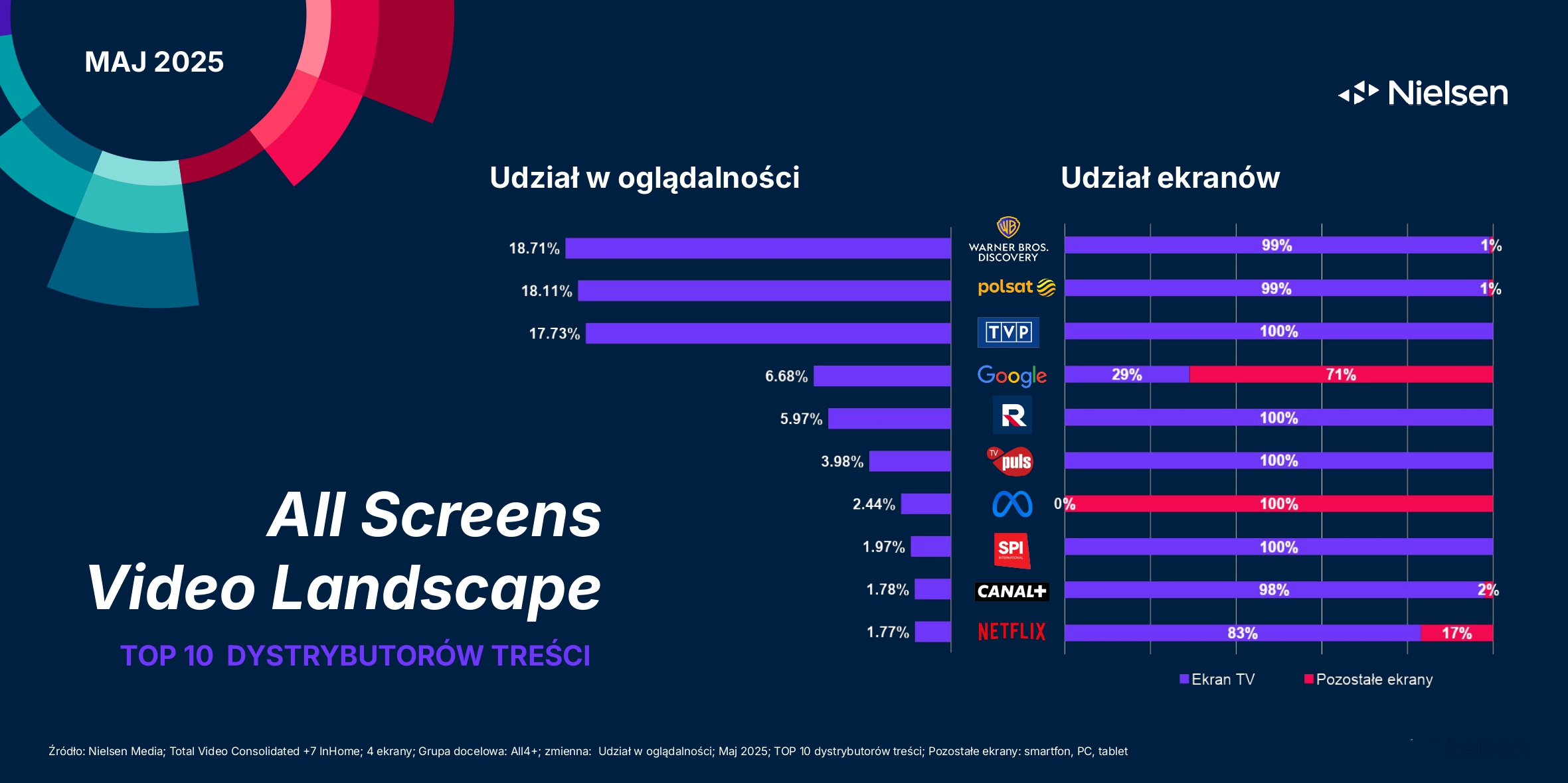 Warszawa - Polska, 24 czerwca 2025 r. - Nielsen, globalny lider w dziedzinie pomiaru oglądalności, danych i analiz, opublikował najnowszy, majowy raport All Screens Video Landscape, obejmujący oglądalność (połączenie całkowitego zasięgu i spędzanego czasu) z czterech ekranów: telewizorów, PC/laptopów, smartfonów i tabletów.