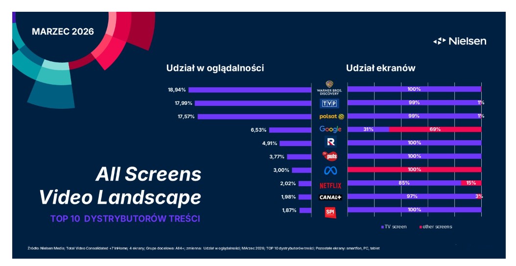 Ranking miesięczny dystrybutorów pozostał w marcu stabilny – Warner Bros. Discovery utrzymało pierwszą pozycję trzeci miesiąc z rzędu. Co istotne, raport ten po raz pierwszy uwzględnia wyniki platformy internetowej TVP w ramach całkowitego wyniku Holdingu Telewizja Polska. Pozwala to na uzyskanie bardziej holistycznego obrazu polskiej widowni na telewizorach, komputerach, smartfonach i tabletach. Znajduje to odzwierciedlenie w danych dotyczących udziału ekranów, które pokazują, że jeden procent treści Grupy TVP był oglądany na urządzeniach innych niż telewizor.