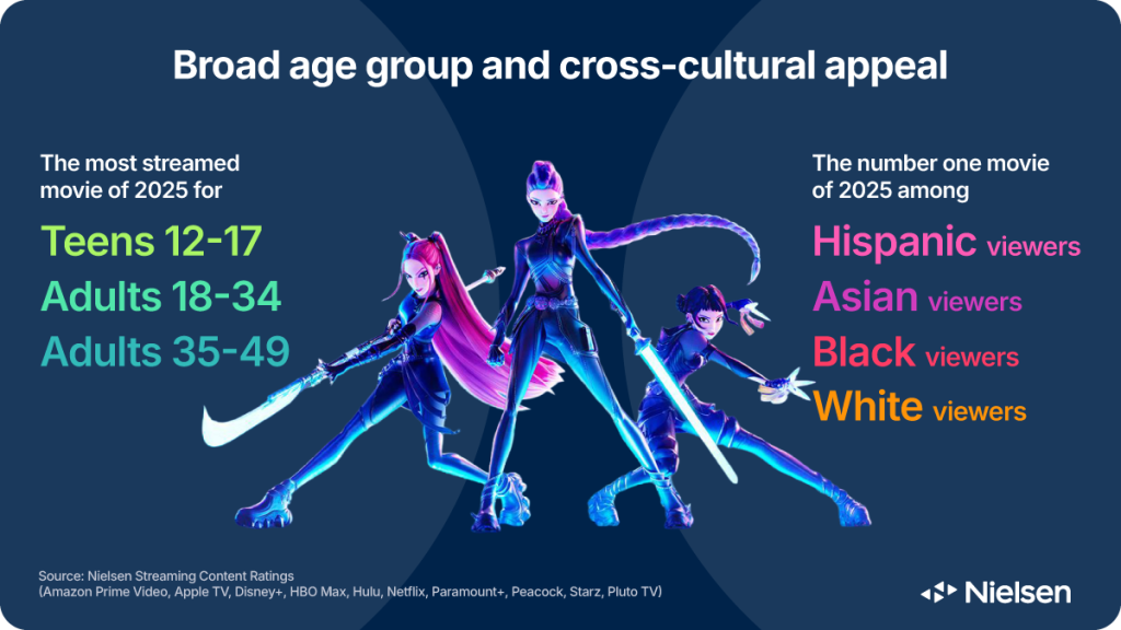 The streaming dominance of KPop Demon Hunters earned Netflix a coveted Artey Award for the Top Streaming Kid’s movie in 2025, and its popularity continues to resonate with audiences in 2026—logging 2.7 billion additional viewing minutes so far this year and remaining in Nielsen’s Top 10 for streaming movies.
