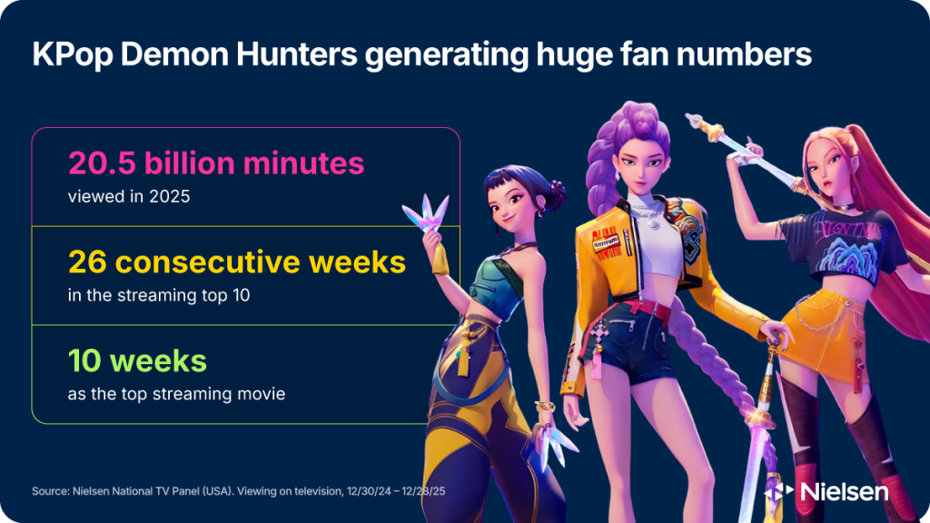 McDonald’s release on March 31 of two KPop Demon Hunters themed meals represents a massive cultural collision where brand investment meets a record-breaking streaming fandom. While its recent double Oscar® win for Best Animated Feature and Best Original Song—a historic first for K-pop—and its Grammy for “Golden” have captured global headlines, Nielsen’s media intelligence highlighted the growing momentum well in advance.