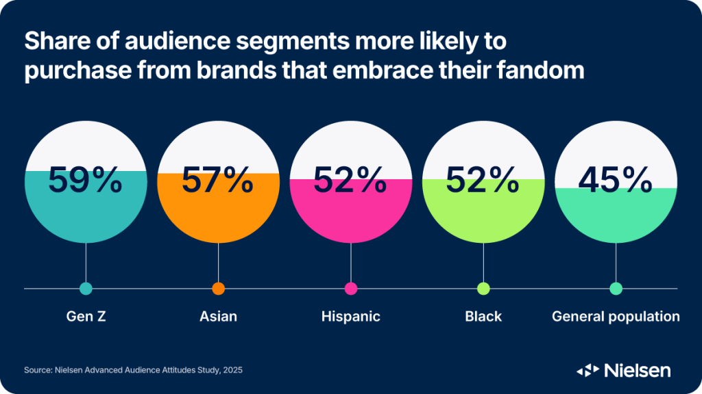 When a brand becomes part of the fandom’s world, fans become customers. The results from Nielsen’s 2025 Advanced Audience Attitudes Study are proof.